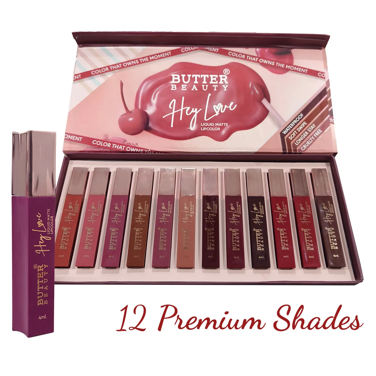 Butter Beauty Hey Love Liquid Matte Lip Color features 12 premium, highly pigmented matte shades packed in an elegant suitcase-style box. Smooth, long-lasting and perfect for professional or everyday use, this collection is ideal for gifting and complete lip styling.
